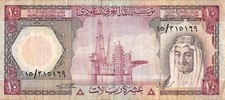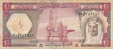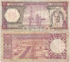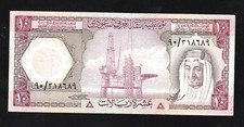 L. AH1379 (1977). Lilac and brown on multicolor underprint. Portrait of King Faisal at right, oil drilling platform at center. Back: Oil refinery. Watermark: King Faisal.