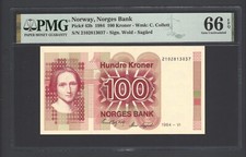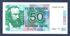 1984. Green on multicolor underprint. Aasmund Olavsson Vinje at left. Back: Stone carving with soldier slaying dragon. Watermark: 50 repeated within diagonal bars.