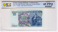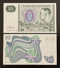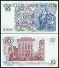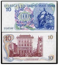 1968. Deep blue on multicolor underprint. Svea standing with ornaments at right. Back: Violet-brown. Old Riksbank building at left center. Watermark: Crowned monogram King Charles XI. Issued note.