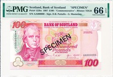 18.8.1997. Red-violet and red-orange on multicolor underprint. Sir W. Scott at left, bank arms at center. Back: Golf outing at center. Bank head office building at lower left, medallion of Pallas seated, arms and Watermark: Sir W. Scott. Printer: TDLR (without imprint).
