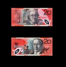 (20)05. Black and red on orange and pale green underprint. Mary Reiby at center, sailing ship at left. Compass OVD in transparent window at lower right. Biplane at left, Reverend John Flynn at center right, camel at right on back. Names added below portraits. Polymer plastic.