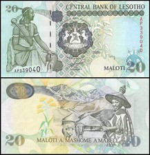 2007. Deep olive-green and blue-black on multicolored underprint. Seated King Moshoeshoe I at left, arms at center and as watermark. Mosotho herdsboy with cattle near huts at center right on back. Printer: TDLR. Thin security foil.