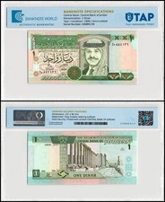 AH1416/1996. Green on olive and multicolored underprint. King Hussein wearing headdress at center right and as watermark. Ruins of Jerash at center right on back. With title THE HASHEMITE KINGDOM OF JORDAN added on back. As specimen.