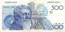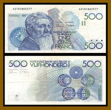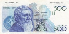 ND (1982-1998). Deep blue-violet and deep green on blue and multicolored underprint. Constantin Meunier at left center. Underprint of two coal miners and mine conveyor tower at center right. Five circular designs on back. Signature 3 and 10, or 4 and 10, or 4 and 11, or 4 and 12, or 4 and 13, or 5 and 14, or 5 and 15.