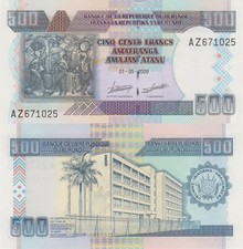 1.5.2009. Dark blue and multicolored. Bas relief of natives, trees, and cauldron. Back: central bank of Burundi building at center.