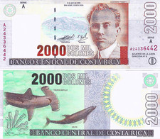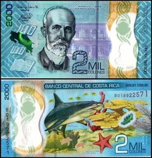 9.4.2003. Brown-orange and dark brown on multicolored underprint. C. Picado T. at center right and as watermark, Coco Island in underprint at center. Hammerhead shark at left, dolphin at lower center on back. Series A. Printer: F-CO.