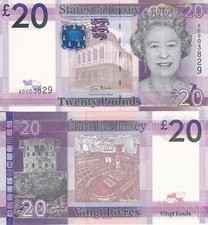 ND (2010). Violet on multicolored underprint. Queen Elizabeth II facing at right. The States (parliament building) at center. Back: La Rocco Tower in St. Jean at left, interior of States chamber at center. Watermark: Jersey cow head. Printer: (T)DLR.