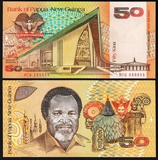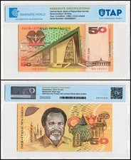 ND (1989). Brown, red, blue and multicolor underprint. National Parliament building at center. Back: Foreign Affairs Minister M. Somare at left center, ceremonial masks at right. Watermark: Central Bank logo. As a specimen banknote. Overprint: SPECIMEN.