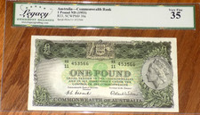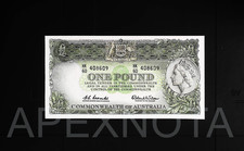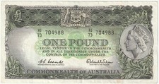 ND (1953-1960). Dark green on multicolor underprint. Arms at upper center, medallic portrait Queen Elizabeth II at right. Signature H. C. Coombs and R. Wilson with title GOVERNOR / COMMONWEALTH BANK OF AUSTRALIA below lower left signature. Back: Facing medallic portrait C. Sturt and H. Hume.Watermark: Capt. Cook. As a replacement banknote.