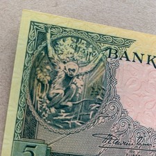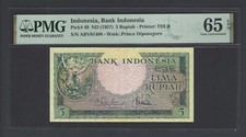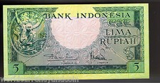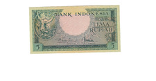 ND (1957). Green on pink and yellow underprint. Orangutan at left. Back: Prambanan temple in blue. As a specimen banknote.