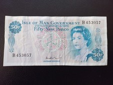 ND (1972). Blue on multicolored underprint. Triskele arms at center and as watermark, older portrait of Queen Elizabeth II at right. Signature title LIEUTENANT GOVERNOR. Printer: BWC. Old sailing boat on back. 126x62mm.
