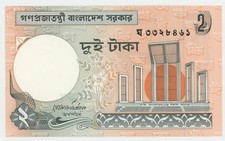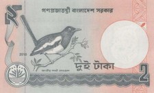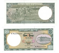 ND (1988-1991). Gray green on orange and green underprint. Shahid Minar, Martyr's Monument at right. Back: Dhyal or Magpie-robin at left. Watermark: Tiger's head. Solid security thread. Four signature varieties.