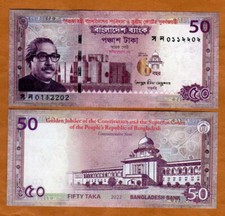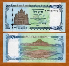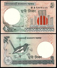 2007. Gray green on orange and green underprint. Shahid Minar, Martyr's Monument at right. Back: Dhyal or Magpie-robin at left. Watermark: Tiger's head. 3mm wide segmented security thread.
