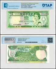 ND (1995). Deep green on multicolored underprint. Queen Elizabeth II at right center, arms at center, artifact at right. Back green, sugar cane harvest at center on back. Watermark: profile Fijian head. Printer: TDLR. As a specimen. No punch cancellation.