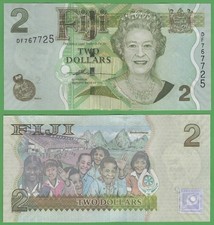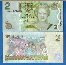 ND (2007). Green on multicolored underprint. Mature bust of Queen Elizabeth II at right, arms at upper right. Novel numbering on both serial numbers. Mohar (sovereign locket) at lower left. Back: faces of diverse group of children during school games. Fiji National Stadium at left. Mount Korobas. Signature title Acting Governor. As a replacement banknote with the serial prefix ZA.