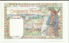 27.7.1942-3.4.1945. Multicolor. Veiled woman and man with red fez at right. Like number84. Back: City with ruins of amphitheatre in background.Watermark: BANQUE DE L'ALGÉRIE. As a specimen banknote.