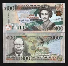 ND (2000). Dark brown and dark green on multicolored underprint. Queen Elizabeth II at center right and as watermark, turtle at lower center, green throated carib at top left. Brimstone Hill in St. Kitts at left. Sir Arthur Lewis at left, ECCB Central Bank building, and Lesser Antillean Swift at right on back. Printer: TDLR. Clear blue values at upper left and lower right. Segmented security thread. Gold foil starfish at right. Suffix letter V.
