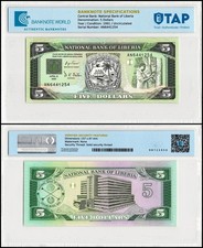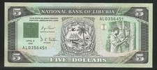 April 6, 1991. Black and deep green on multicolored underprint. Latent image star at left, arms at center, tapping trees at right. Back deep green on multicolored underprint; National Bank Building at center. Printer: TDLR. Republic of Liberia at top on back.