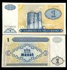 ND (1993). Deep blue on tan, dull orange, and green underprint. Ornate 'value' backs. Watermark: 3 flames. View of Maiden Tower ruins at center. As a specimen banknote.