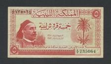 1.1.1952. Red on light yellow underprint. Portrait of King Idris at left, palm tree at right. As a specimen banknote.