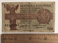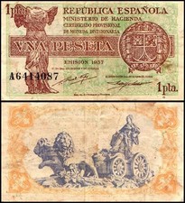 1937. Brown and green. Nike of Samothrace at left. Back: Purple and gold. La Cibeles Fountain in Madrid. Series C.
