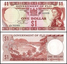 ND (1968). Purple on orange and purple underprint. Queen Elizabeth II at right. Arms heading: GOVERNMENT OF FIJI at upper center. Geometric lathe pattern on back. Watermark: profile of Fijian. Printer: TDLR. No seals. Corners punched out.