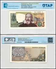 24.10.1983. Brown and green on light tan and olive underprint. Galileo at center, ornate arms at left, buildings and leaning tower of Pisa at right. Signs of the Zodiac on back. Watermark: Man's head. Seal with winged lion.