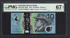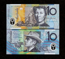 (20)15. Dark blue and purple on multicolored underprint. Man on horseback at left. A.B. "Banjo" Paterson at center, windmill OVD in transparent window at lower right. Dame Mary Gilmore at center right on back. Names added below portraits. Polymer plastic. Dates are indicated by the first two digits of the serial number. Printer: NPA.