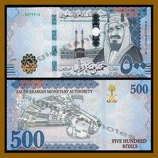 2016. Black, green, and peach on multicolored underprint. King Abdullah at right, coin at center. Back: Saudi Arabian Monetary Authority building.