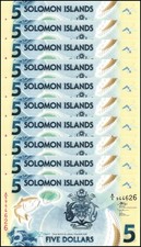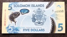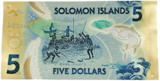 ND (2019). Blue on blue and ocher underprint. On the front of the note you’ll see the beautiful coral reefs that surround the Solomon Islands form the inspiration for the colour, patterns and texture that appear on the note. With the reef below and the surface above, a Yellowfin Tuna fiercely battles the fisherman who makes the catch with a traditional hook. The scene of the fish and the hook is used to create large clear windows — unique to polymer banknotes. When it catches the light a colour shift from the amber of the fish and the green of the rippled sea and hook both shift to blue. This effect extends to the two large windows at the opposite end whose design is inspired by traditional wood carvings. On the back of the note is a spear fishing scene that illustrates the sense of community and social cohesion that fishing brings while respecting the environment and preserving our marine world for those who follow.