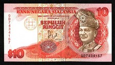ND (1989). Red-orange and brown on multicolored underprint. T. A. Rahman at right and as watermark. Railway station at Kuala Lumpur on back. Printer: TDLR. Vertical serial number and no markings for the blind. Segmented foil over security thread. As a specimen banknote.
