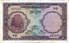 ND (1955). Purple. Sculpture (Bayon head) at left. Back: royal palace entrance at Chanchhaya at right. Watermark: Buddha. Printer: BWC (without imprint). As a specimen banknote.