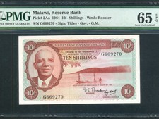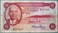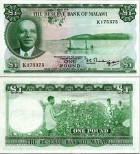 Law of 1964. Brown on multicolored underprint. Portrait of Dr. Hastings Kamuzu Banda at left, fishermen in boat on Lake Malawi at center. Workers in tobacco field on back. Signature title GOVERNOR only. Watermark: rooster. As a specimen banknote.