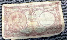 27.1.1940-13.6.1947. Brown on light blue and brown underprint. Portrait King Albert and Queen Elisabeth at left. Like number 94 but withoverprint. Date at top center. 4 signature varieties. Back: Bruxelles squre at center right. Overprint: TRÉSORERIE on face and THESAURIE on back. As a specimen banknote.
