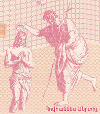 2004. Violet and brown. Saint Gregory the Illuminator at center right, Gandzasar Cathedral of Saint John the Baptist in Madakert in background; coat of arms at left. Ancient Christian cross at left on back, baptism of Jesus Christ scene at center right.
