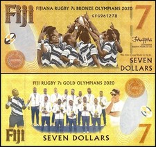 2020 (2022). Multicolored on yellow and gold underprint. Commemorating Fiji's Rugby 7's bronze medal in the 2020 olymics. Players holding up rugby ball at center. Players with medals and flower at center on back.