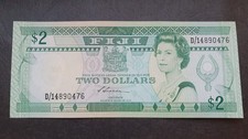 ND (1988). Green on multicolored underprint. Modified portrait of Queen Elizabeth II at right center, arms at center, artifact at right, and now authority Reserve Bank of Fiji. Sugar cane harvest at center on back. Watermark: profile Fijian head. Printer: BWC. As a specimen with signature punched out.