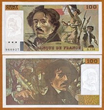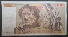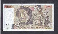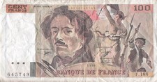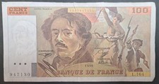 1990-1991. Brown. Eugene Delacroix at left center and as watermark. Marianne holding tricolor, part of Delacroix' painting "La Liberte Guidant le Peuple" at right. 'Cent Francs' at upper left on face not just faint outline but has a fill color as well.