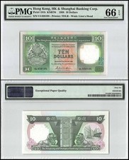 1.1.1988. Hong Kong and Shanghai Banking Corporation. Deep green on multicolored underprint. Arms at left. Facing lions at lower left and right with new bank building at center on back; sampan and ship at right. Watermark: lion's head. Printer: TDLR. Signature title: EXECUTIVE DIRECTOR.