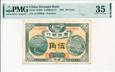 Feb. Yr. 10 (1921). Deep blue-green on orange underprint. Red octagonal seal: ISSUED BY KWANGSI BANK-Tenth Year of the Republic of China. Back: Violet on pale green underprint. Oval hand stamp with similar message as front in Chinese. WUCHOW. (S/M #K36-41).