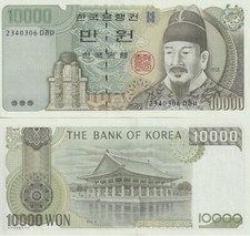 1992; 1998. Grayish olive-green and olive-brown on multicolored underprint. Arms at upper left, young woman with flower basket at center right. Mountain Gumgang on back. Watermark: winged equestrian statue "Chonllima".