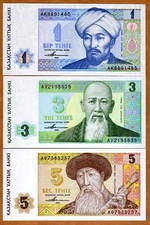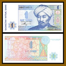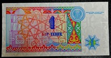 1993. Dark blue on multicolored underprint. Al-Farabi at center right. Back light blue on multicolored underprint; architectural drawings of mosque at left center, arms at upper right. Watermark: symmetrical design repeated.