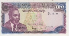 1.7.1978. Purple, dark brown, and dark blue on multicolored underprint. Mzee Jomo Kenyatta at left, values in latent image at bottom left on face. Watermark: Lion's head. Kenyatta statue and tower on back.