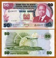 1.7.1987. Dark red and multicolored. Arms at center, President Daniel Toroitich Arap Moi at right. Watermark: lion's head. Back olive: jet aircraft flying over Jomo Kenyatta airport.