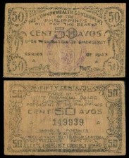 1943 WWII Japanese Invasion of Philippines 50 CENTAVOS World War 2 Note (VG/F)
