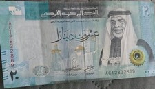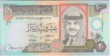 AH1422/2001. Dark brown, green, and red-brown on multicolored underprint. King Hussein wearing headdress at center right and as watermark. Al-Aqsa Mosque "Dome of the Rock" at left center on back. With title THE HASHEMITE KINGDOM OF JORDAN added on back.