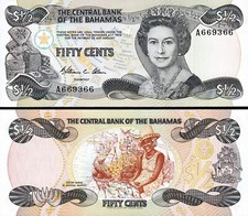 Central Bank of the Bahamas at top. Law of 1974. Brown on multicolored underprint. Produce market on back.