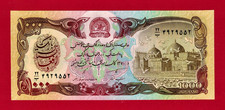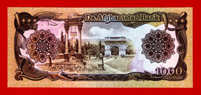 Dark brown and deep red-violet on multicolored underprint. Mosque at Mazar-e-Sharif at right. Victory Arch near Kabul at left center on back.