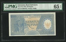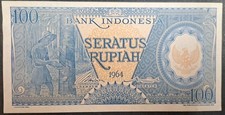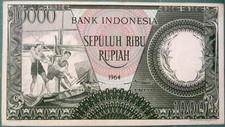 1964. Brown and red on light tan underprint. Rubber tapper at left. Kalimantan house at center on back. Watermark: Water buffalo. Printer's name: P. T. Pertjetakan Kebajoran Imp. 16mm long at right on back.