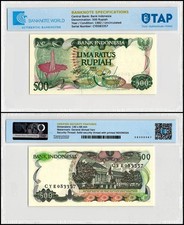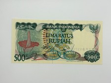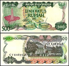1982. Dark green on multicolored underprint. Man standing by Amorphophallus Titanum giant flower at left. Bank of Indonesia on back. Watermark: General A. Yani.
